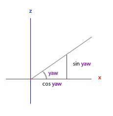 如果我们可视化偏航角是从 x 轴开始的逆时针角度,我们可以看到 x 边的长度与 cos(yaw)相关。同样,z 边的长度与 sin(yaw)相关。