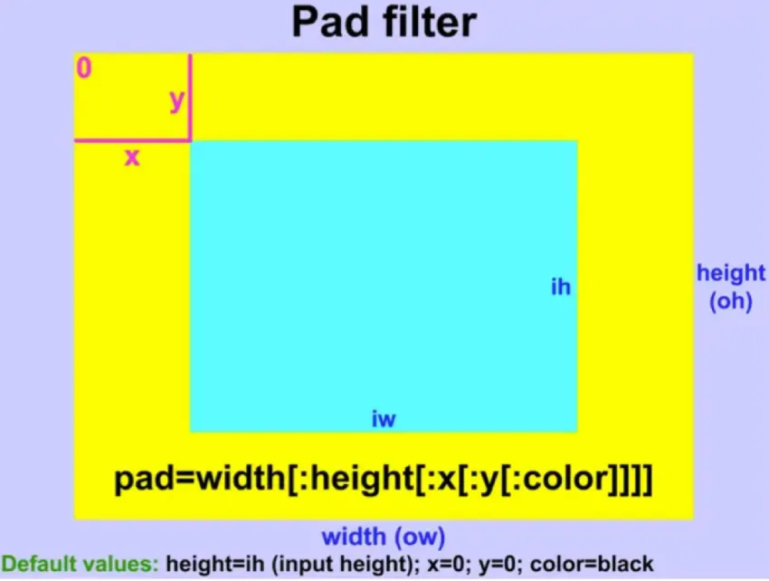 | 语法 | pad=width[:height[:x[:y[:color]]]] 括号内的参数均为可选 |