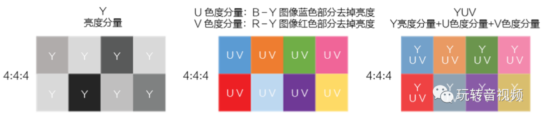 YUV 颜色空间格式是由一个 Y 的“亮度”分量和两个 UV “色度”分量组成的,其中,Y 被称为灰度分量,UV 是色度分量,U 被称为蓝色投影,V 称为红色投影。色度信号分辨率最高的格式是 YUV444,意思是每1点 Y 采样相对应的1个 U 采样和1个 V 采样,如下图所示: