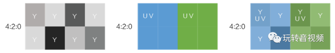 YUV420,则表示每4点 Y 采样相对应的1个 U 采样和1个 V 采样,具体情况如下图所示: