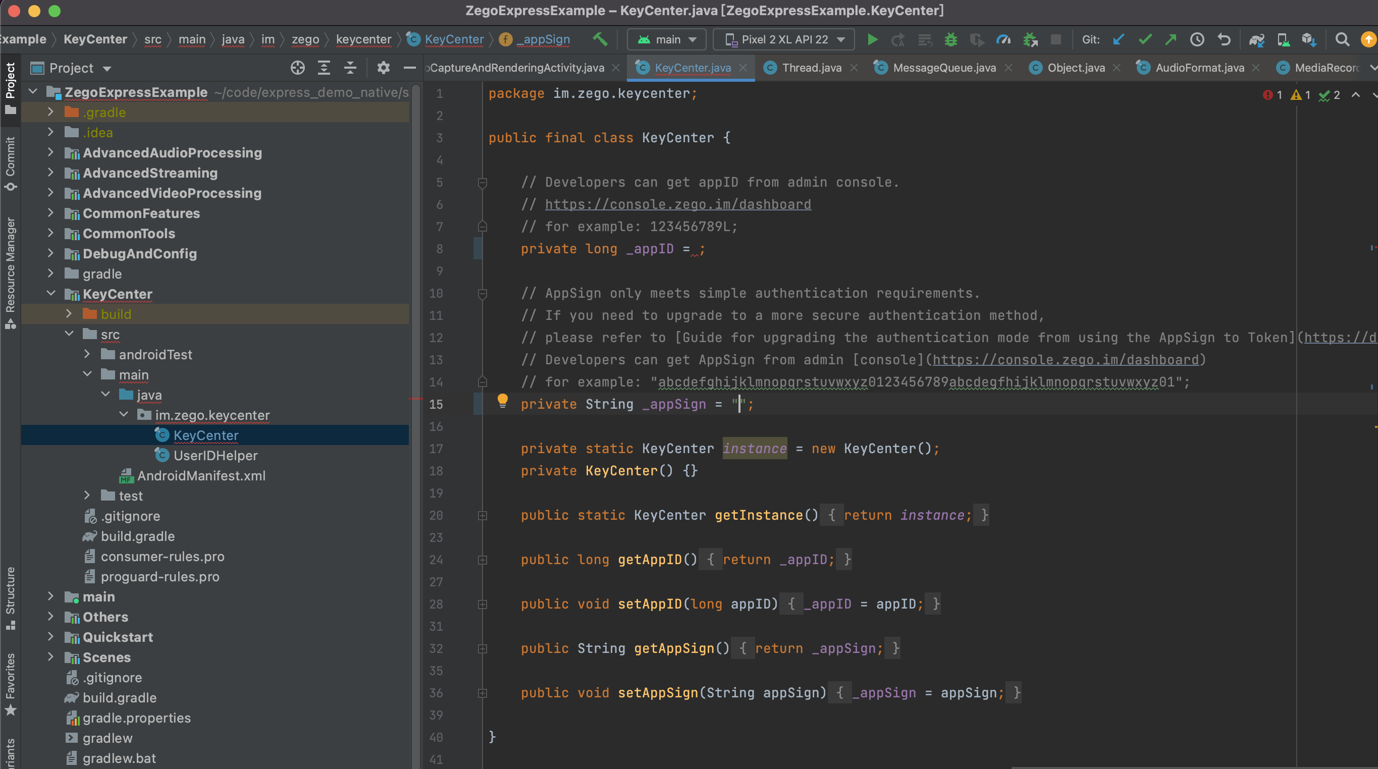 - 示例源码中缺少 SDK 初始化所需的 “appID” 和 “appSign”,需要修改 “./KeyCenter/src/main/java/im/zego/keycenter” 目录下的 “KeyCenter.java” 文件,请使用本文 前提条件 已获取的 AppID 和 AppSign 正确填写(注意:需要在 AppID 后加 L),否则示例源码无法正常运行。
