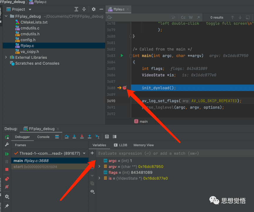 然后就可以愉快地进行断点调试了,找到ffplay.c的main函数,打一个断点,然后debug运行一下。