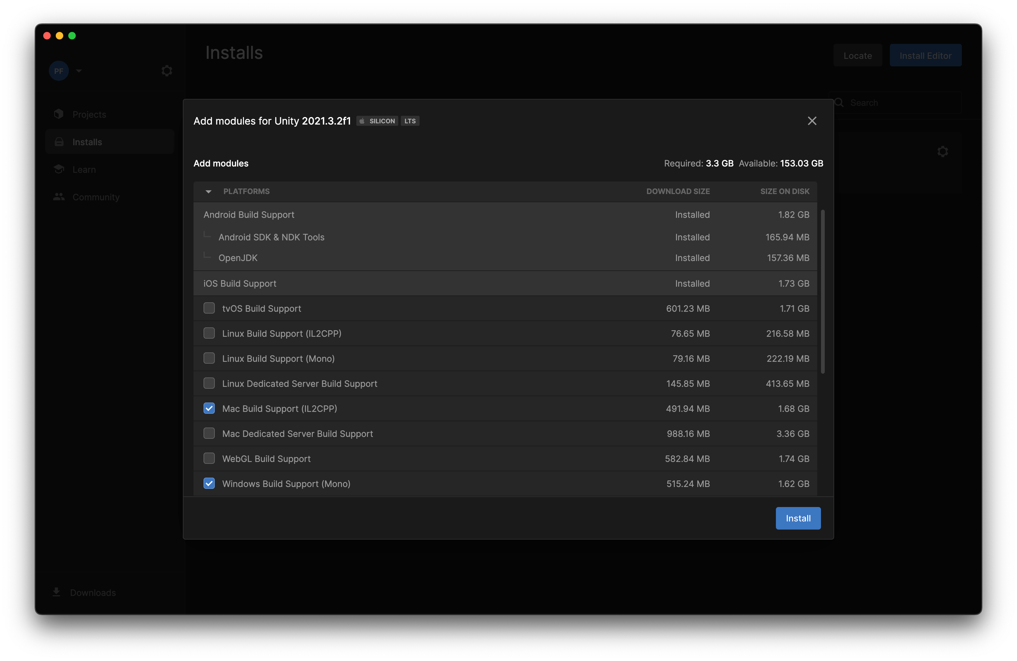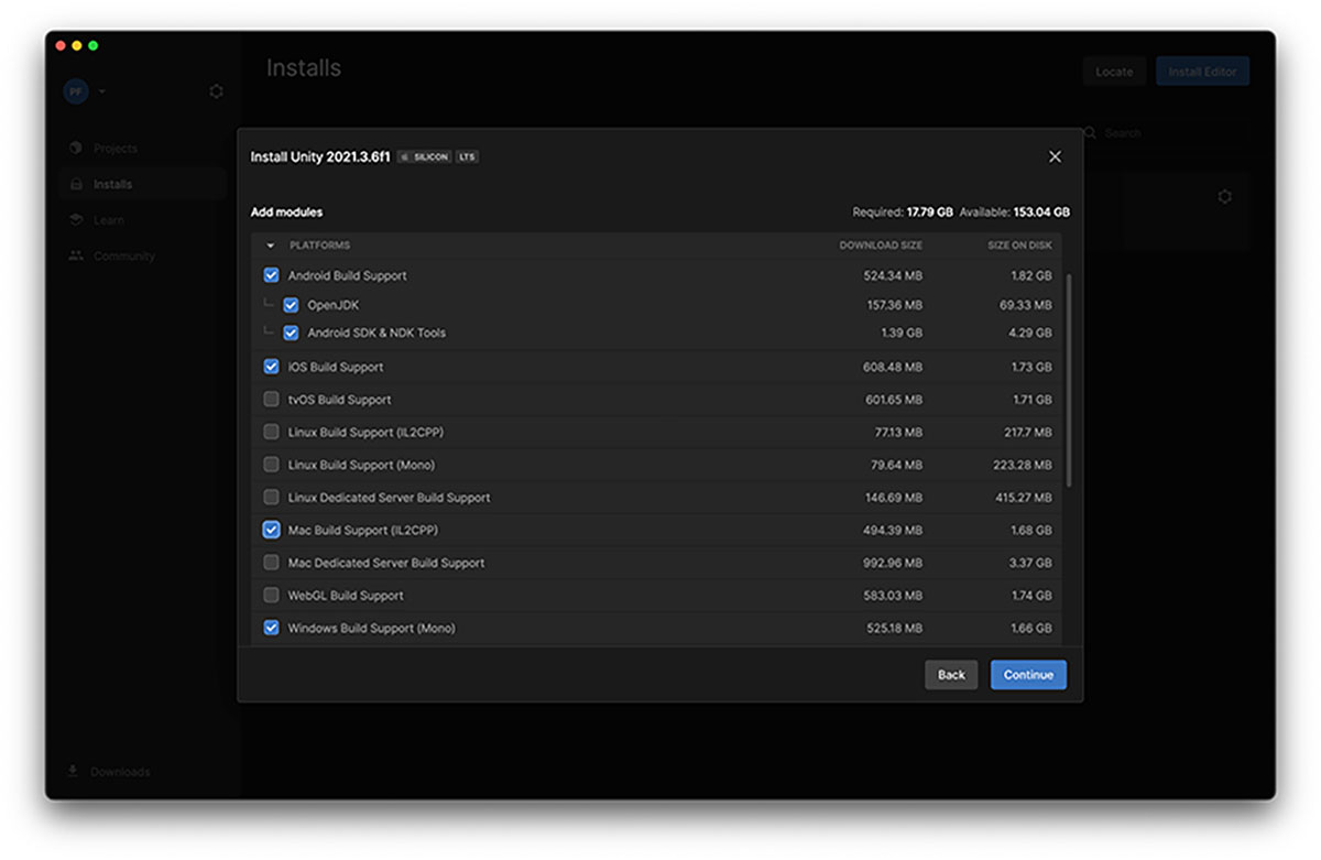 安装 Unity 2018.4.21f1 或以上版本。若未安装,可以在 Unity 官网 下载 Unity Hub,然后安装您需要的 Unity 版本(若不清楚,建议您安装最新的 LTS 版本)。下载时,推荐根据自身需要运行到的平台,勾选对应的 Plaforms 模块一起下载,以在 macOS 上安装为例: