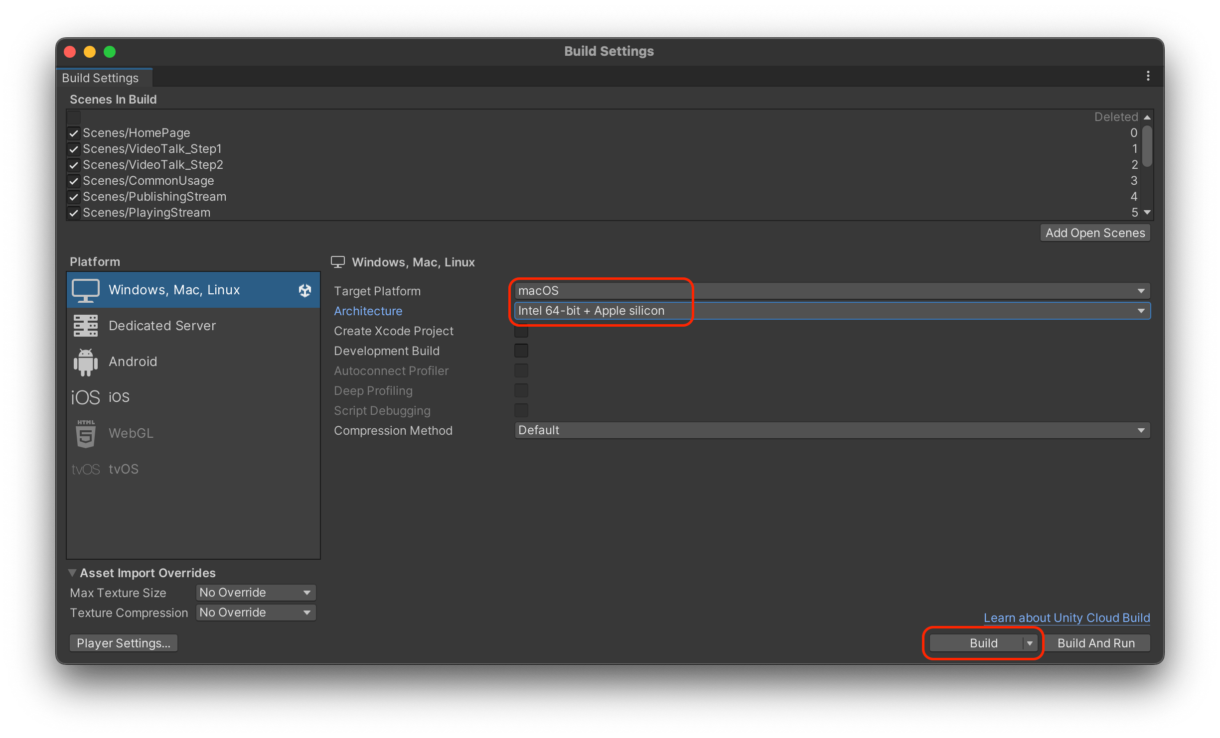 a. 参考步骤 7,将 “Platform” 切换到 “macOS” 平台,选择好要构建的架构,比如 Intel + Apple silicon,然后点击 “Build” 生成 App 到本地。