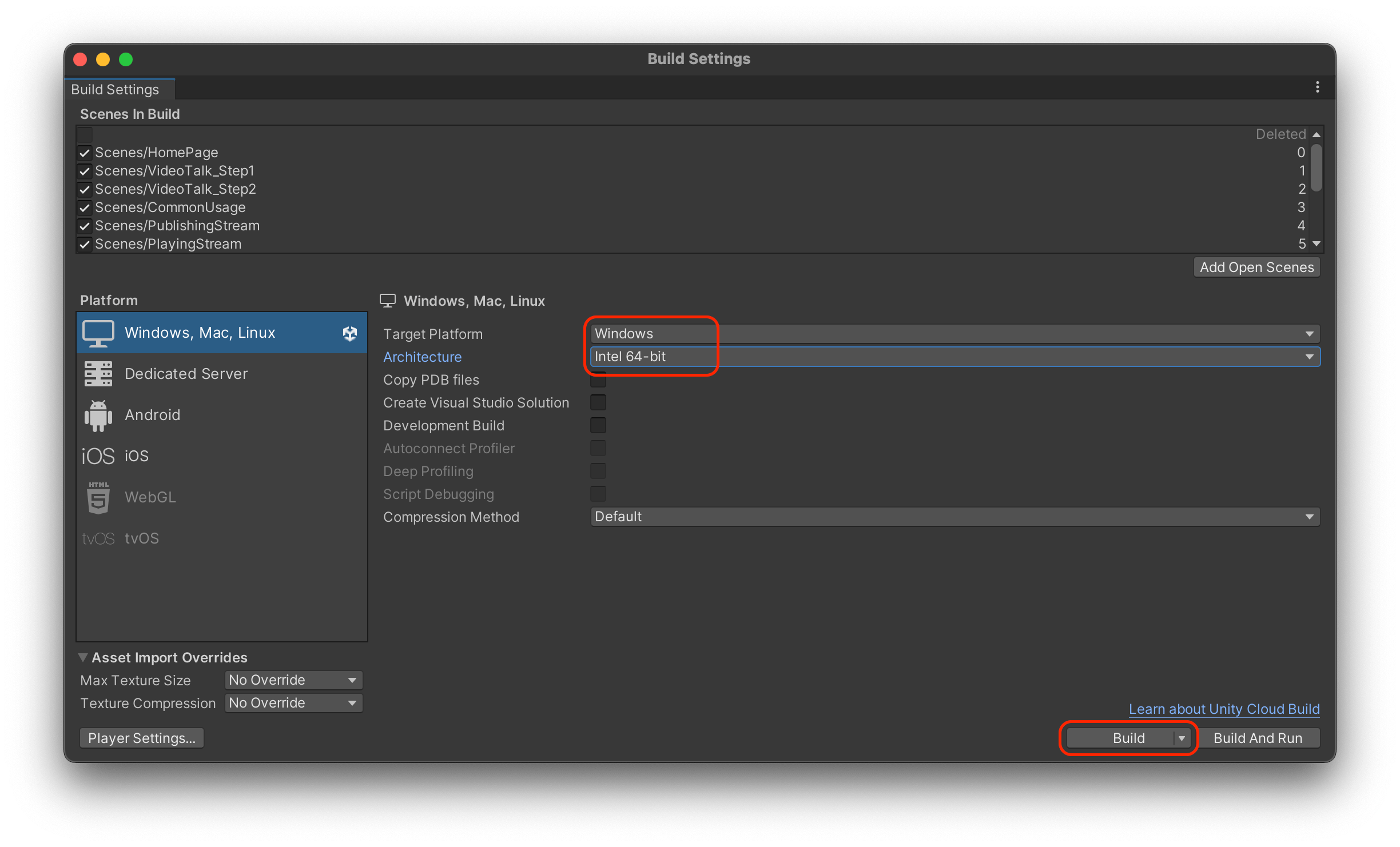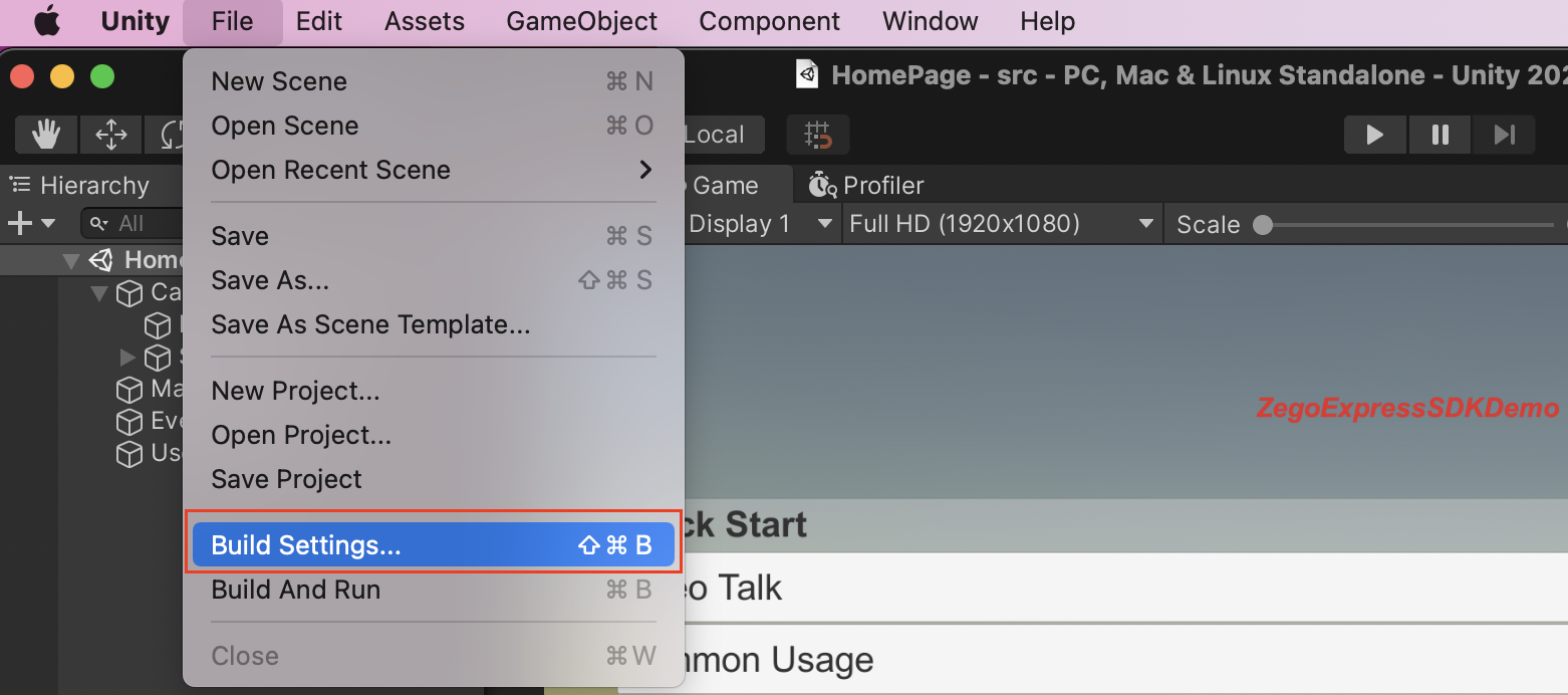 6. 在上方菜单栏,选择 “File > Build Settings”。