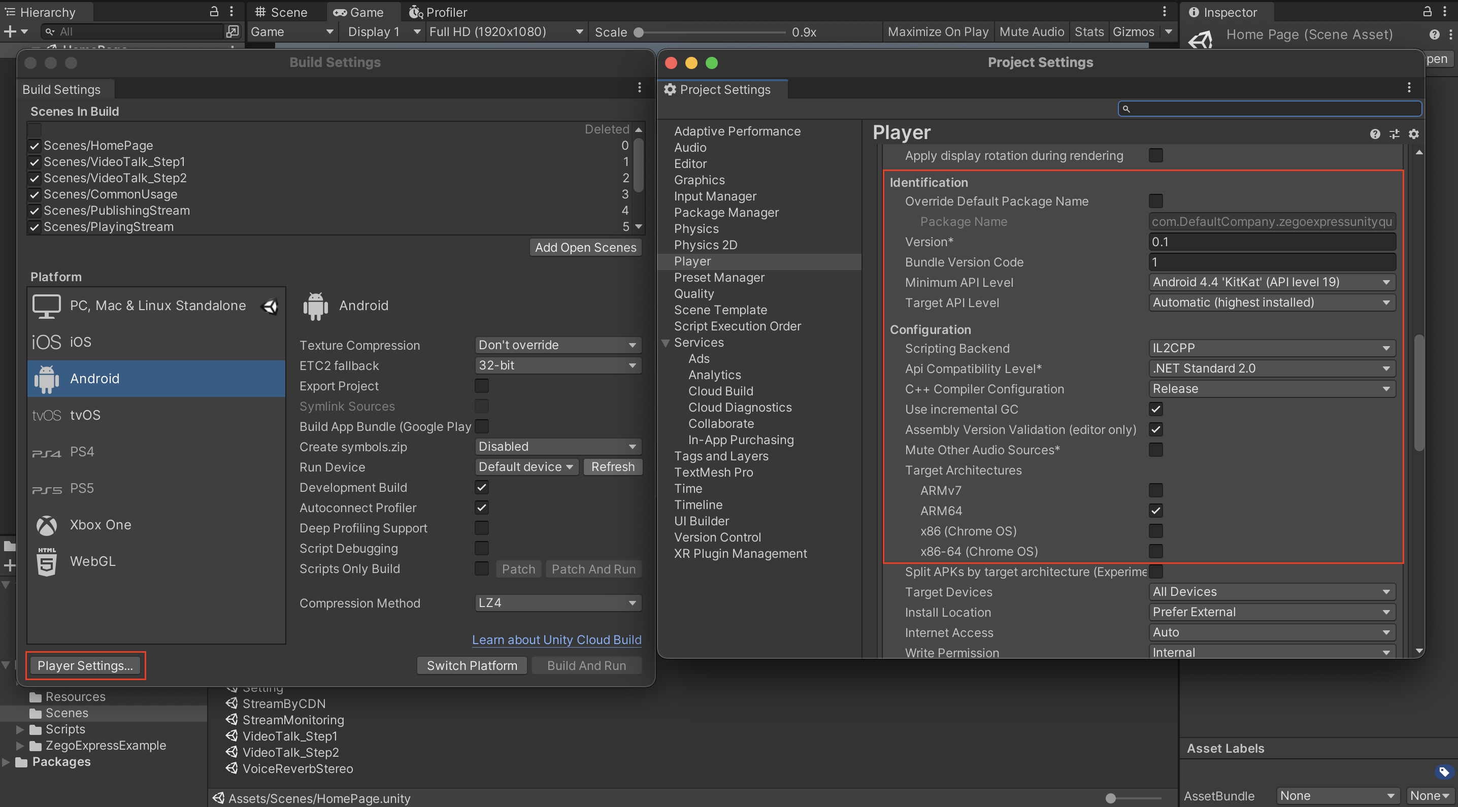 - 运行到 Android 设备: a. 参考步骤 7,将 “Platform” 切换到 “Android” 平台,单击 “Player Settings”,设置包名等配置。
