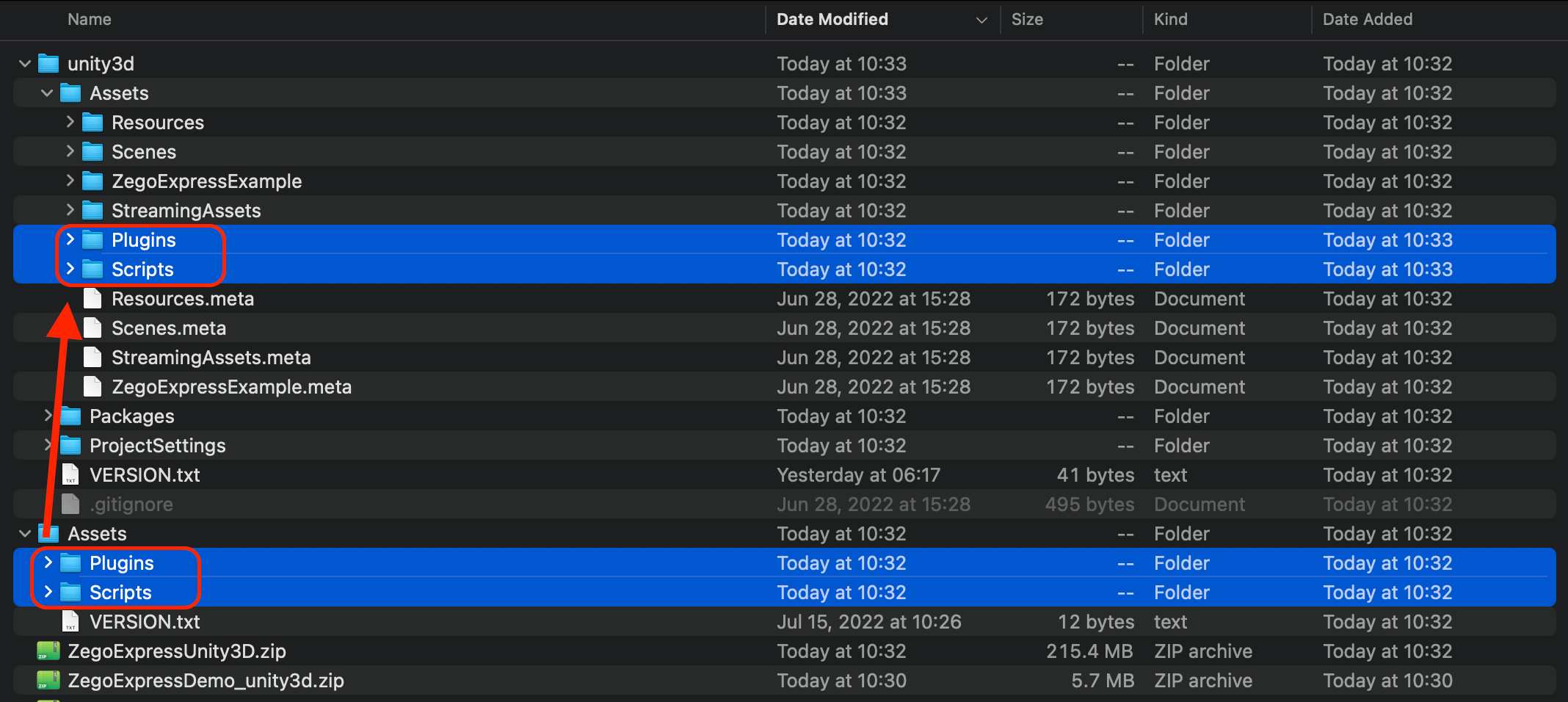 - 下载的示例源码中缺少 SDK,需要先 下载 SDK 包,并解压。 参考 集成 SDK 文档,将解压后的 SDK 包拷贝到工程的 “Assets” 目录下;并根据要运行的平台做额外的处理,否则 App 会构建失败。如下图所示:
