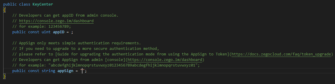 2. 示例源码中缺少 SDK 初始化所需的 “appID” 和 “appSign”,需要修改 “Assets/ZegoExpressExample/KeyCenter.cs” 文件,请使用本文前提条件已获取的 AppID 和 AppSign 正确填写,否则示例源码无法正常运行。