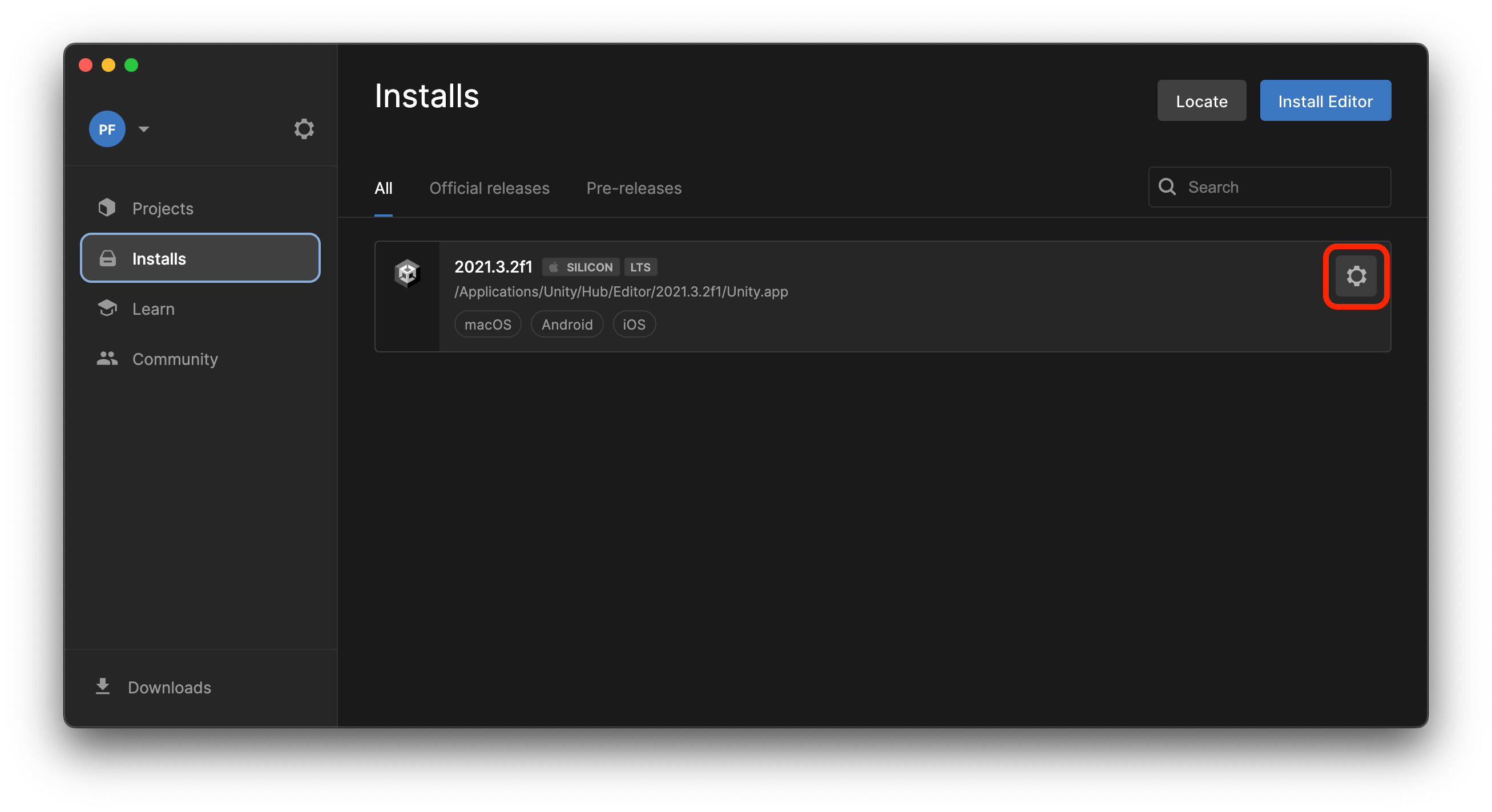- 确保 Unity 已经安装了需要运行到的平台所对应的 Platfroms 模块。若已经安装 Unity,但没有安装相关 Platroms 模块,需要下载对应模块,以在 macOS 上安装为例:打开 Unity Hub,单击左侧的“安装”选项,选择需要安装的 Unity 版本,单击右上角图标选择 “添加模块” 选项,即可勾选并下载对应模块。