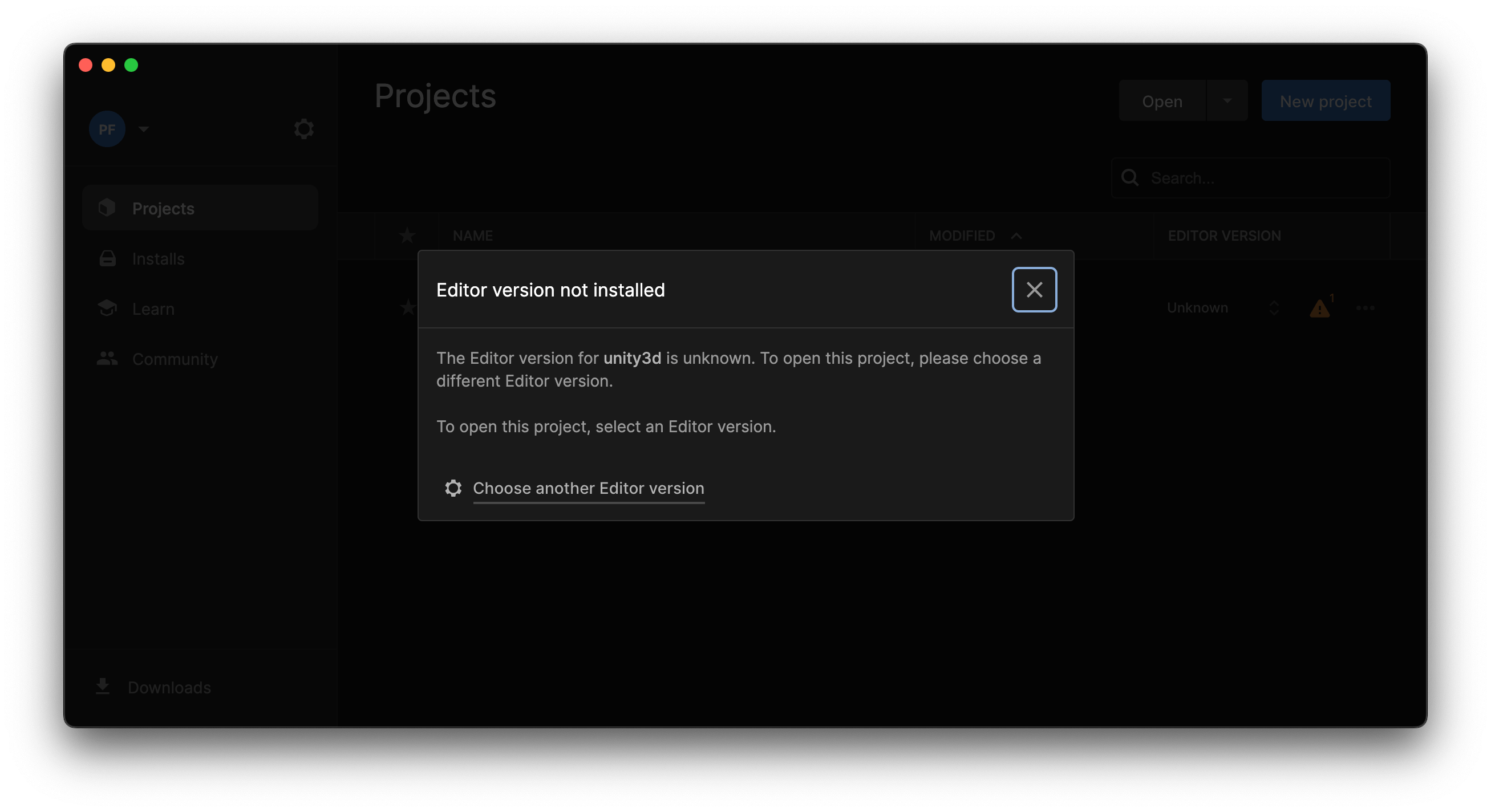 4. 打开后,可能会弹出提示:“Editor version not installed”,找不到示例源码工程使用的 Unity Editor 版本。此时,选择其它 Unity Editor 版本,并指定您正在使用的 Unity 版本即可。
