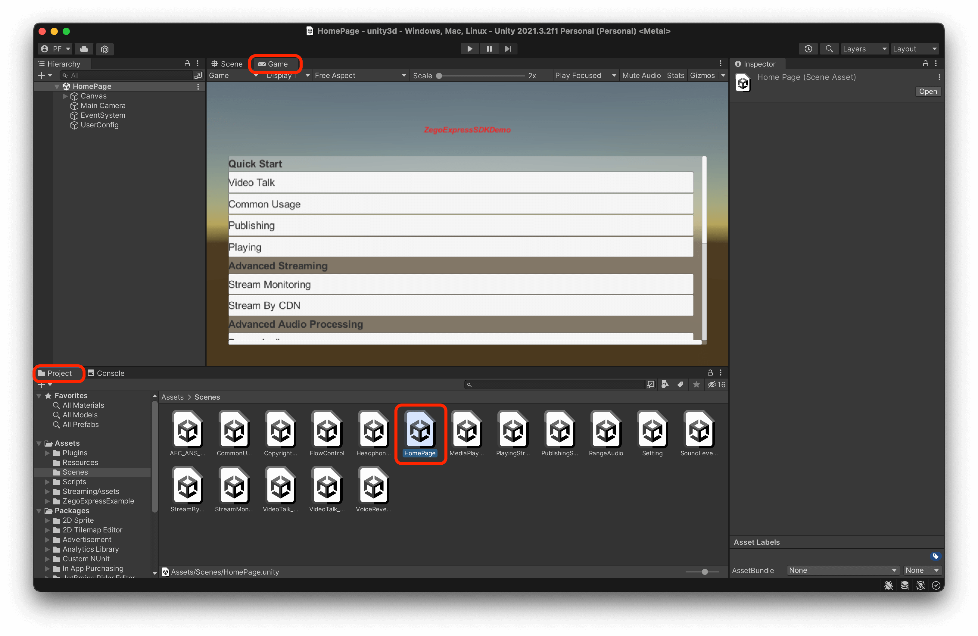 5. 打开工程后,选择左下角 “Project > Assets > Scenes” 目录下的 “HomePage”,双击,然后选择 “Game” 选项卡,可以看到示例源码主页的场景。