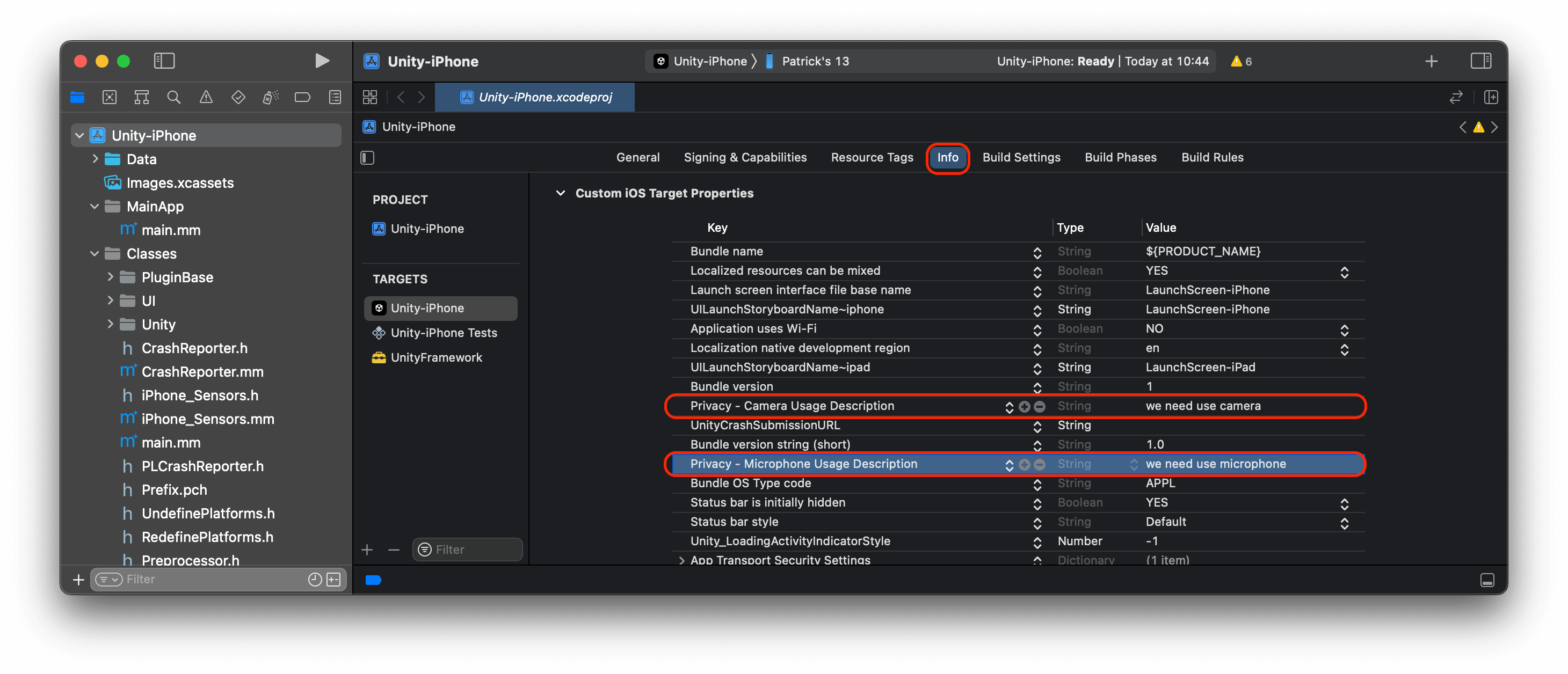 - c. 选择 “Info.plist” 文件,添加摄像头和麦克风权限。