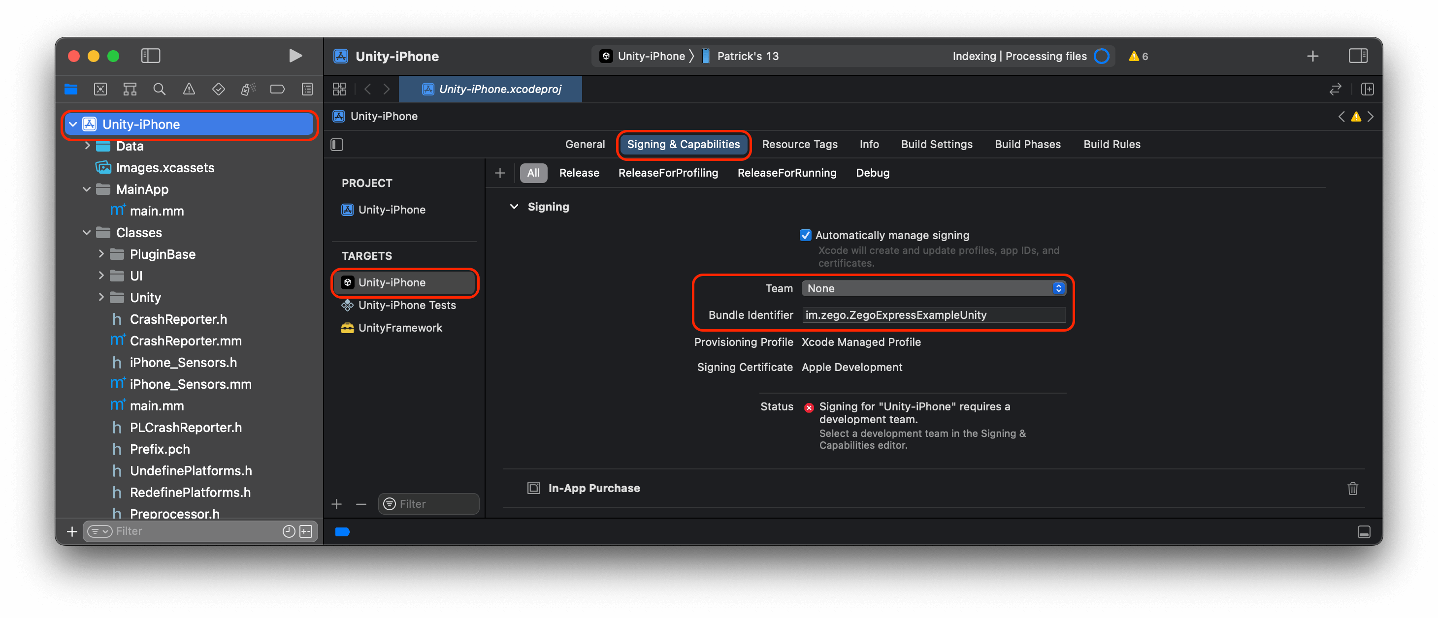 - 运行到 iOS 设备: a. 参考步骤 7,将 “Platform” 切换到 “iOS” 平台,单击 “Build” 将 iOS 工程保存到本地,通过 Xcode 打开本地工程。 b. 在打开的 Xcode 工程中,打开 “Unity-iPhone” Target 的 “Signing & Capabilities” 选项卡,首先确保勾选 “Automatically manage signing”,然后切换 “Team” 为自己的 Team,再修改 “Bundle Identifier” 为自定义的 Bundle ID。