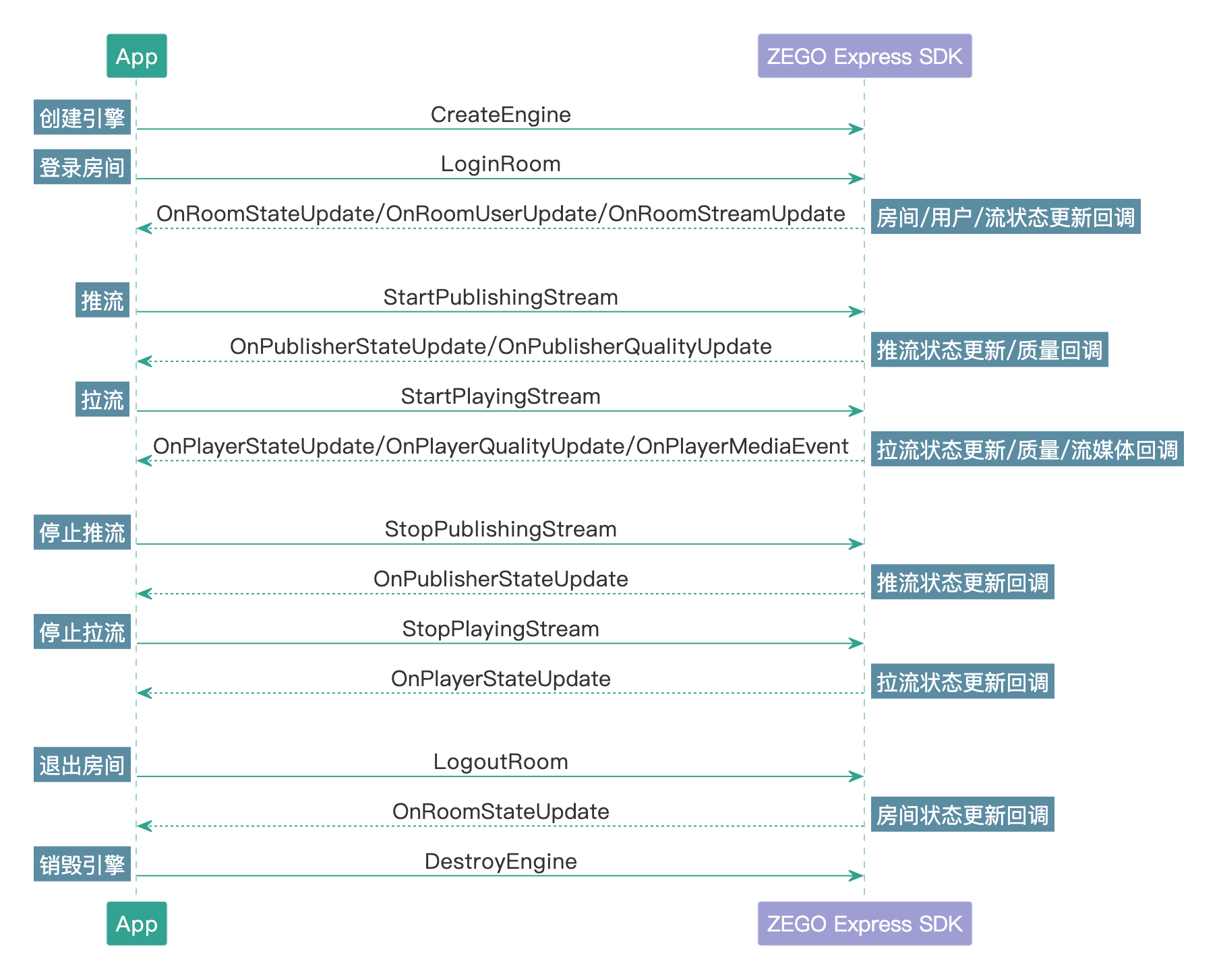 整个推拉流过程的 API 调用时序如下图: