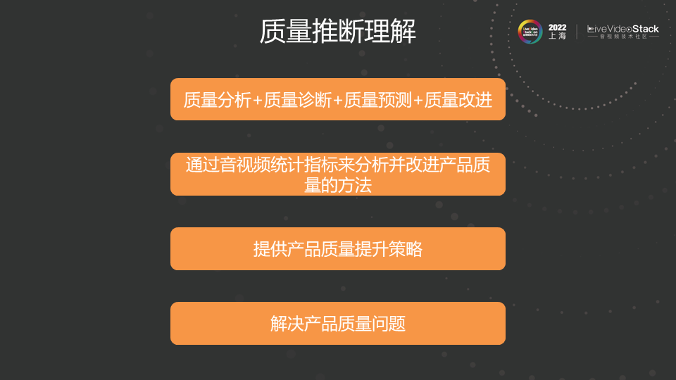 我们可以将质量推断理解成是一个质量分析、诊断、预测、改进的综合过程,利用音视频统计指标来分析并改进产品质量的方法,为产品质量提升提供策略支撑,并最终解决产品质量问题。所以质量推断的最终目的就是为了解决产品中遇到的各种各样的质量问题。