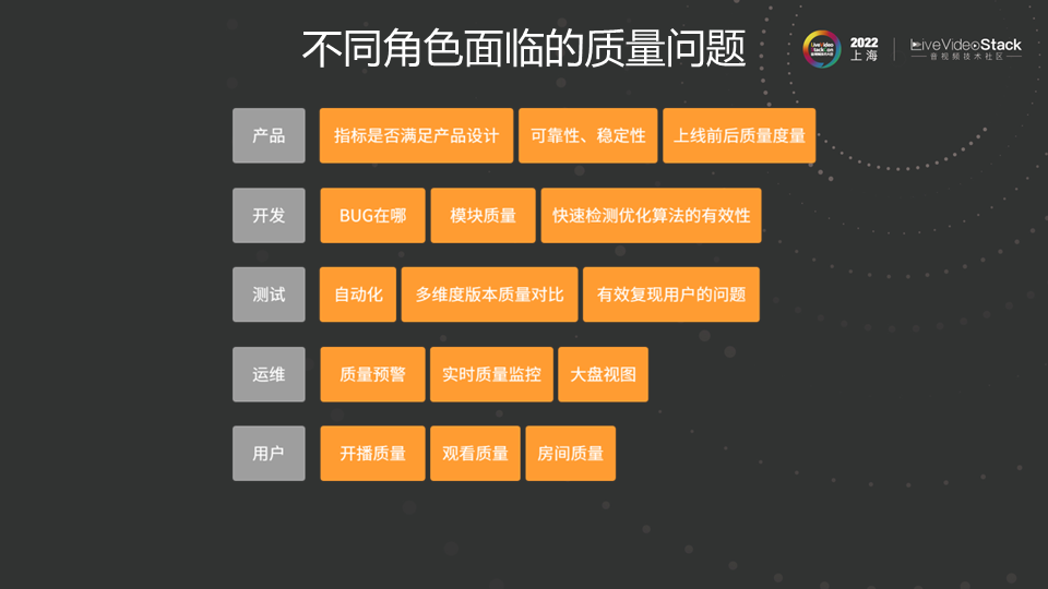 很显然,不同的角色面临的质量问题是不一样的。对于产品,会面对指标是否满足产品设计、产品的可靠性和稳定性以及产品上线前后质量度量等问题;对于开发,会面对如何快速标记bug产生的大致位置、模块质量的评价方式、快速检测优化算法的有效性等问题;对于测试来说,对解决重复测试问题的自动化工具的需要比较迫切,另外也会面对多维度版本质量对比、如何有效复现用户的问题等问题;对于运维,需要有可靠的质量预警方式、实时质量监控方式以及随时查看大盘视图的方式;对于用户,特别是主播,会比较关注自己的开播质量、观看质量、房间质量等问题。为了解决这一系列问题,我们设计开发了质量推断系统。