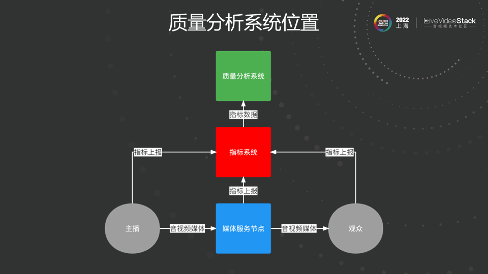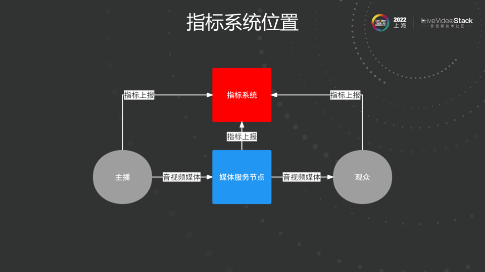 在介绍指标系统之前,先要了解指标系统在产品中处于的位置。因为目前质量推断系统主要应用在直播产品中,所以接下来的图例也是以直播产品的方式进行讲解。这张图展现的是在直播的过程中,主播、媒体服务节点和观众都会将自己统计到的指标数据上报到指标系统,由指标系统统一进行存储管理,供后续的质量分析使用。