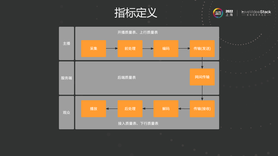 指标的定义就是要覆盖这样的业务流程,所以基于这三端(主播端、服务端、观众端)定义了五大类的质量表。主播端主要是开播质量表和上行质量表;服务端主要是后端质量表;观众端主要是接入质量表和下行质量表。