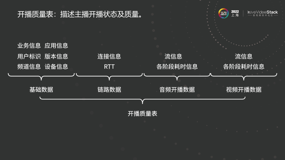 开播质量表用于描述主播开播状态及质量,共有四大类数据:基础数据(业务信息、应用信息、用户标志、版本信息、频道信息、设备信息)、链路数据(连接信息、RTT)、音频开播数据(流信息、各阶段耗时信息)和视频开播数据(流信息、各阶段耗时信息)。这里的耗时指的是采集、前处理、编码、传输等各个阶段的耗时情况,同时也包含了协议交互的耗时。通过这些指标,就能对主播开播过程中的各项性能指标具有很好的了解。