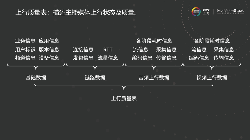上行质量表用于描述主播媒体上行状态及质量。主播开播之后,它就进入到持续的媒体上行过程。直播过程中的质量就是通过这个表来衡量的,也是包括四大类数据,基础数据与开播质量表类似;链路数据,除了连接信息和RTT之外,还包括发包信息和流量信息的统计;音视频上行数据除了流信息和各阶段的耗时,还包括采集、编码、传输模块的统计信息。通过这些数据,就能够很好了解主播上行的质量状况。