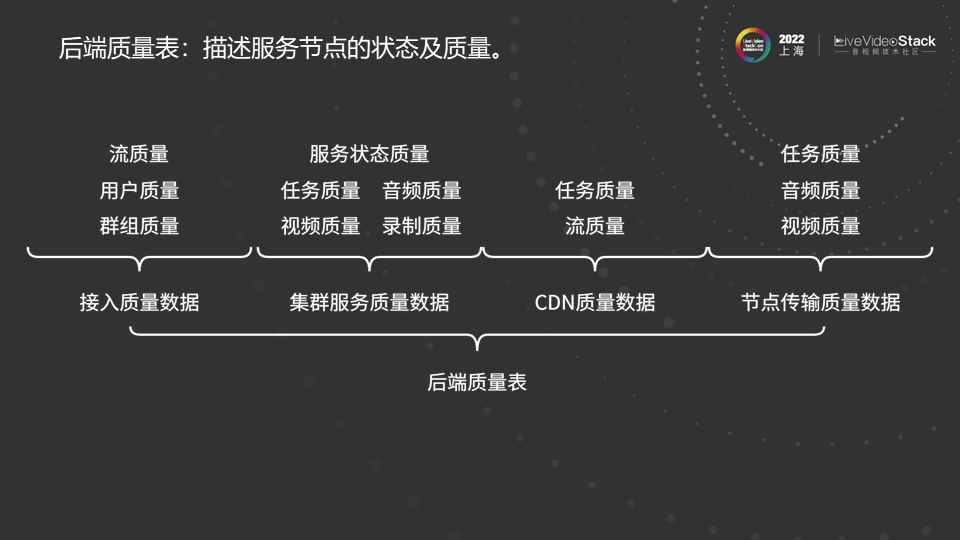 后端质量表用于描述服务节点的状态及质量,因为后端的业务比较复杂,所以质量表非常多,因为支持接入的用户和方式多、业务多、媒体从主播到观众后端服务节点中转多,对这些都需要进行质量统计。目前质量推断系统主要是基于用户端侧的,主要利用主播和观众端的质量表进行评价,后端目前还用得比较少。