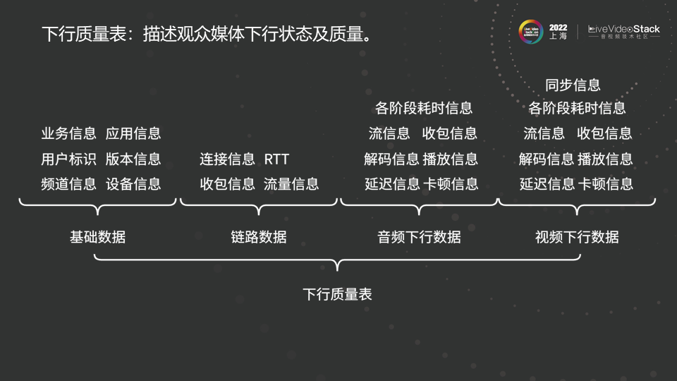 下行质量表用于描述观众媒体下行状态及质量,其基础数据和链路数据与上行质量表类似,差别在于音视频下行数据除了流信息和各阶段耗时,也包含了各个模块的统计信息,例如收包信息、解码信息、播放信息等等。此外,和用户感官相关的一些指标也会进行统计,比如延迟、卡顿,同步等等。