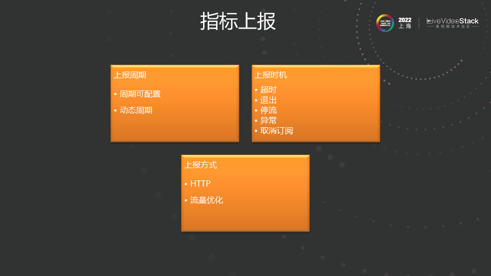 指标定义好之后,就是指标的埋点上报,主要有三个比较重要的方面,首先是上报周期。上报周期会根据业务的精度要求进行统计周期配置,另外也会根据统计精度的要求进行动态周期的调整。其次是上报方式,主要通过HTTP的方式,并对重复指标进行流量优化。最后是上报时机,除了超时上报之外,在主播和观众退出、停流、异常、取消订阅的时候都会触发指标上报,因此保证了整个业务过程中上报的完整性。