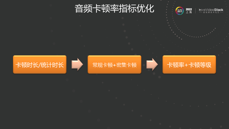 音频卡频率指标优化是指标优化中的一个例子。在业内,一般通过卡顿时长除以统计时长定义卡顿率,但在实际的使用过程中,该定义还是比较宽松的,现实中统计到的卡顿率经常为0,但用户仍然会有卡顿的感觉。所以,通过常规卡顿加密集卡顿的方法来定义卡顿率会更加合适。常规卡顿就是前面定义的方式,密集卡顿是一些短时的连续的卡顿,造成的观众感官上卡顿的感觉。所以最终通过卡顿率加卡顿等级来定义音频卡顿率。