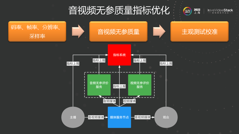 另一个例子是音视频无参质量指标优化。最开始是通过码率、帧率、分辨率、采样率这些指标来表征音视频原始的质量,但在实际操作中这种评价是非常不准确的,因为其不具有代表性和通用性。因此,引入了音视频无参质量评价服务,最终通过大量的主观测试和其他测试手段,不断校正音视频无参质量评价服务的准确性。音视频无参质量评价服务主要在后端节点运行,通过在后端节点对音视频的媒体片段进行打分,最终将统计到的质量分指标上报到指标系统,最后供质量分析使用。
