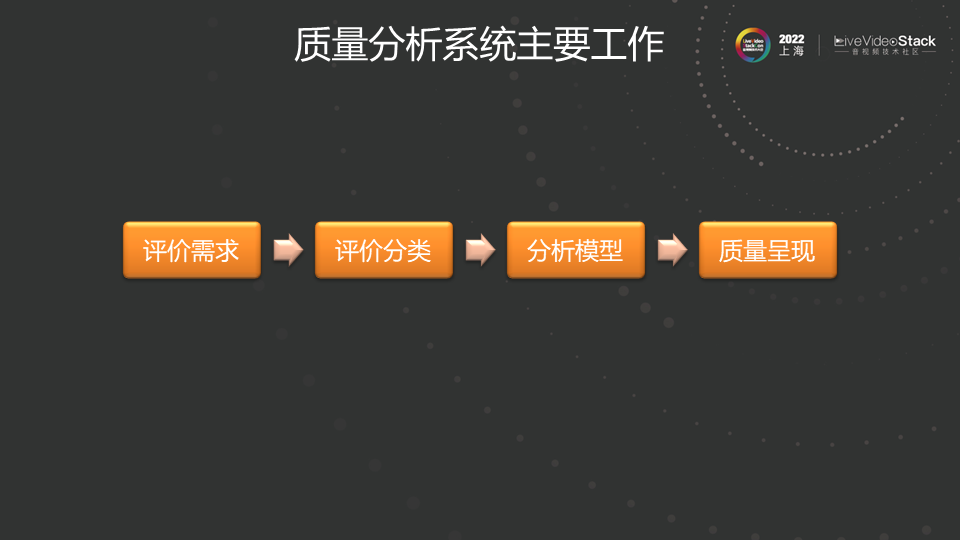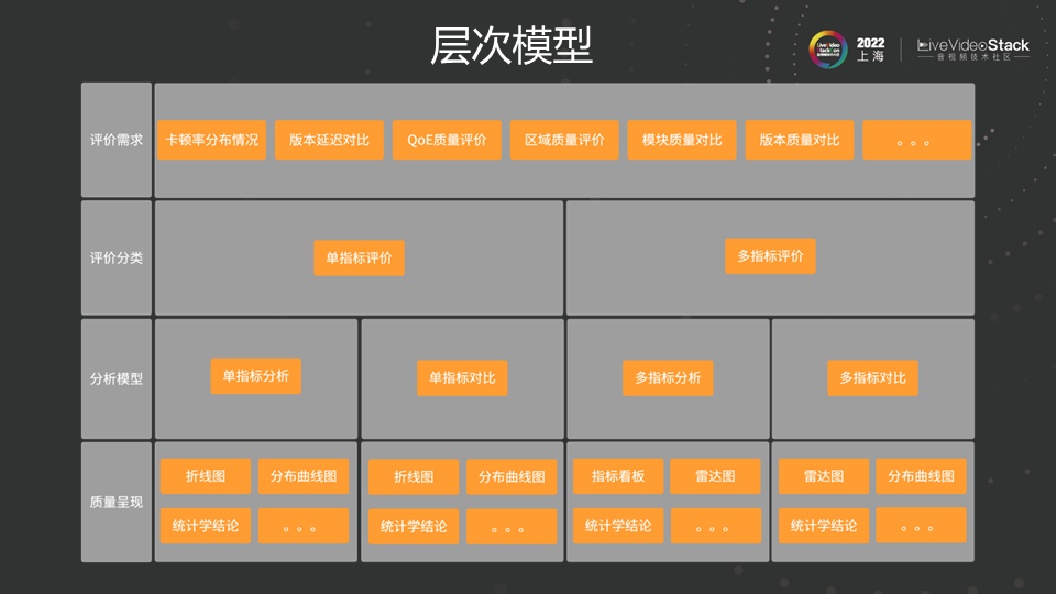 这张图就是刚才提到的层次模型。不同角色面临的问题不一样,随着业务的发展,质量问题会层出不穷,所以为了更好的质量分析的扩展性,在最外层定义了评价需求层来处理各种用户的质量问题,比如卡顿率分布情况。卡顿率分布情况通常是用卡顿率单个指标进行质量分析的,但我们可以基于单个用户、多个用户或版本和区域进行卡顿率分布情况的分析;类似质量问题还有版本延迟对比,版本延迟质量分析依赖于延迟单个指标进行多个版本质量差异的对比;另外还有QoE质量评价,是基于多个指标的,目前的指标选择上会依赖于音视频无参原始评价质量、音视频的卡顿率延迟、视频的帧率进行综合评价,因此是基于多个指标 的综合分析过程;同理,区域质量评价也是依赖于多个指标的;此外,模块质量对比,很显然衡量一个模块的质量不是依赖于单个指标的,也是依赖于多个指标的;最后版本质量对比是一个综合对比,同样也是依赖多个指标。