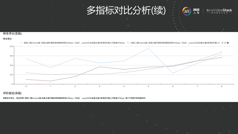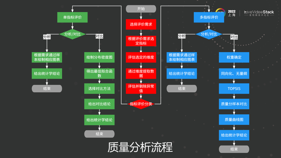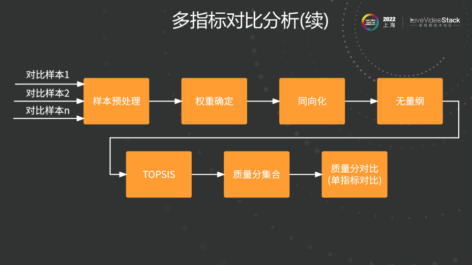 多指标分析流程相对复杂。首先对对比样本进行预处理,然后采用变异系数法或专家赋权的方式进行权重确定,接着对各个指标进行同向化。进行同向化的理由是在质量评价的时候每一个指标对质量的影响是不一样的,比如延迟越小越好,帧率越大越好。另外,还要进行无量纲的处理,消除由单位不一样带来的量纲的影响。随后采用TOPSIS,将每一个对比样本中多指标的集合量化为一个质量分,最终每一个对比样本都是一个质量分的集合。此时可以将多指标评价降维至单指标对比分析,通过对比能够得到对比样本的质量排序。
