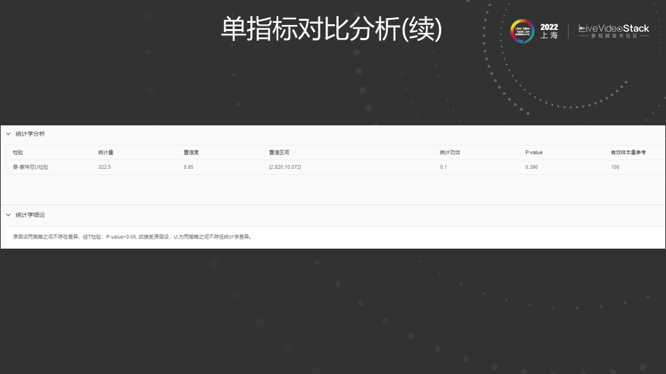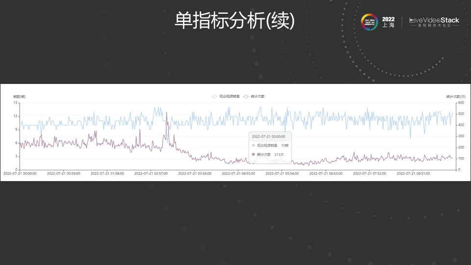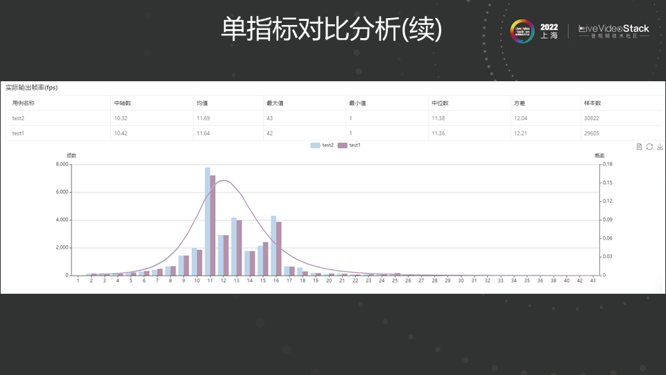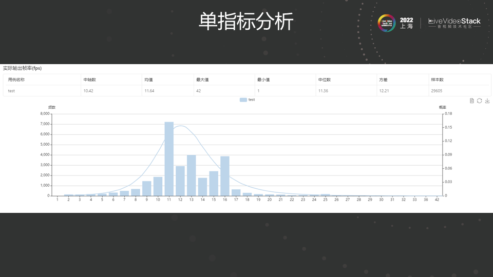 这是单指标分析的例子,以观众端帧率为例,会给出分析样本统计学的结论,例如均值、最大值、最小值、中位数、方差等信息,并根据样本绘制分布图。通常针对多用户或者区域版本的信息,倾向于使用这种分布图的方式。