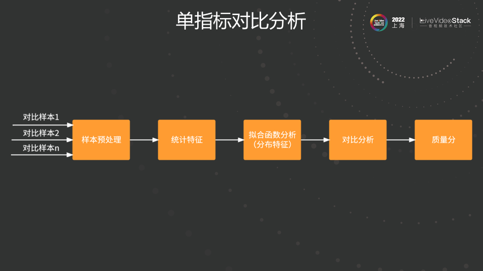 这是单指标对比分析的流程,根据对比样本进行样本预处理,得到统计特征,根据其分布特征得到拟合函数,最终经过对比分析后能够对每一个样本进行打分,通过分数就能够比较对比样本的质量排序。