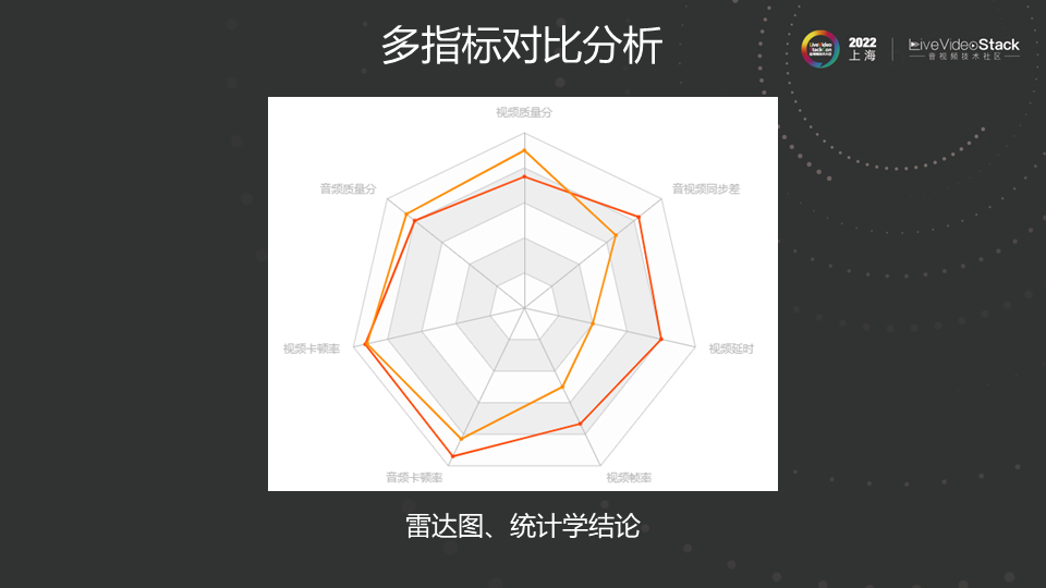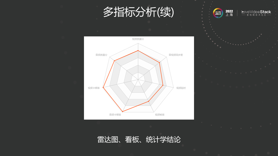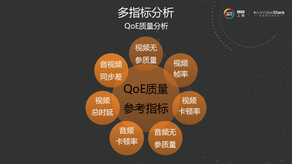 多指标分析以QoE质量分析为例。QoE质量参考的指标主要是音视频无参质量、延迟、帧率、同步差等综合评价用户感官质量,这些指标的选取是根据用户看音视频的感受的指标来定义的。