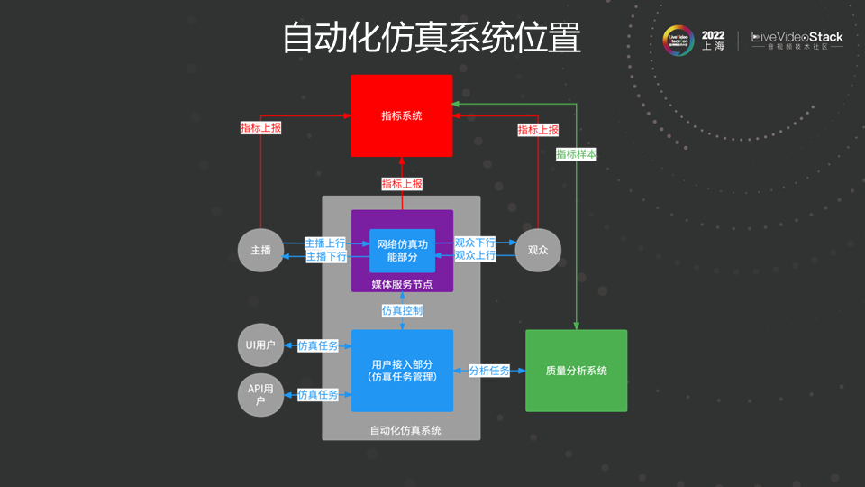 自动化仿真系统在产品中的位置如图所示,蓝色部分就是自动化仿真系统,它是属于分布式的。在用户接入部分提供UI操作的方式,同时也提供了API接口,用户能够通过这两种方式发起仿真任务。由于接入部分会将仿真任务下发到后端节点,后端节点会根据仿真任务对相应主播和观众的上下行进行网络仿真。仿真任务结束后,就可以通知质量分析系统进行相应的质量分析,这就是自动化仿真系统的大致业务流程。