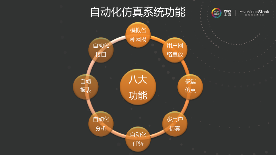 实现自动化仿真系统主要依赖于八大功能:模拟各种网损、用户网络重放、多端仿真、多用户仿真、自动化任务、自动化分析、自动报表、自动化接口。1、模拟各种网损:自动化仿真系统具有类似网络损伤仪的功能,能够对各种弱网条件进行仿真,因此可以对产品进行弱网测试。2、用户网络重放:通过采集用户真实网络数据来实现真实用户的仿真,能够基于真实的网络环境测试产品。3、多端仿真:能够同时支持主播和观众的上下行的网络仿真。4、多用户仿真:能够支持用户的并发使用,大大提高了使用效率。5、自动化任务、自动化分析、自动报表:能够创建一些定时触发的任务,也能创建跟随版本提测的自动化任务的触发。自动化任务执行之后能够进行自动化分析并生成自动报表。6、自动化接口:能够使用户通过编程的方式使用自动化仿真工具,大大提高工具使用的灵活性和方便度。