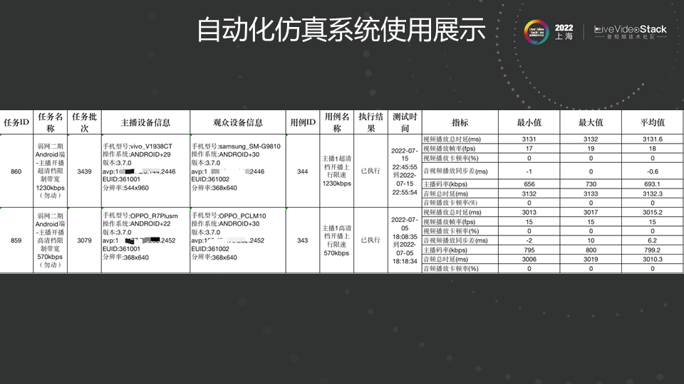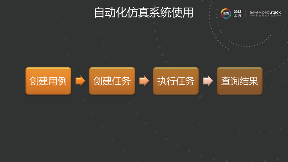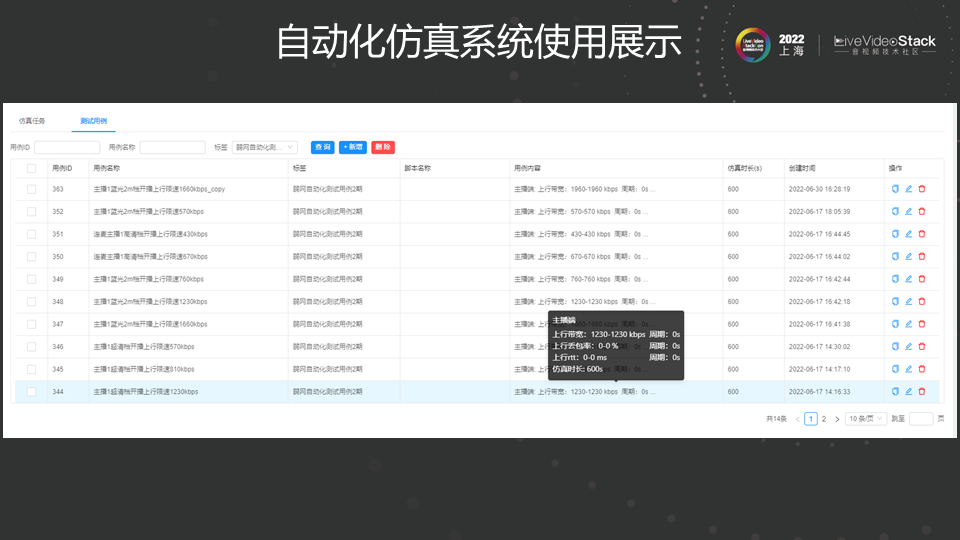 自动化仿真系统的使用也很简单。第一步是创建各种弱网条件的用例;第二步创建任务,一个任务是可以包含多个用例的;第三步执行任务;第四步对结果进行查询对比分析。这个流程既可以通过UI也能通过API接口的方式进行操作。