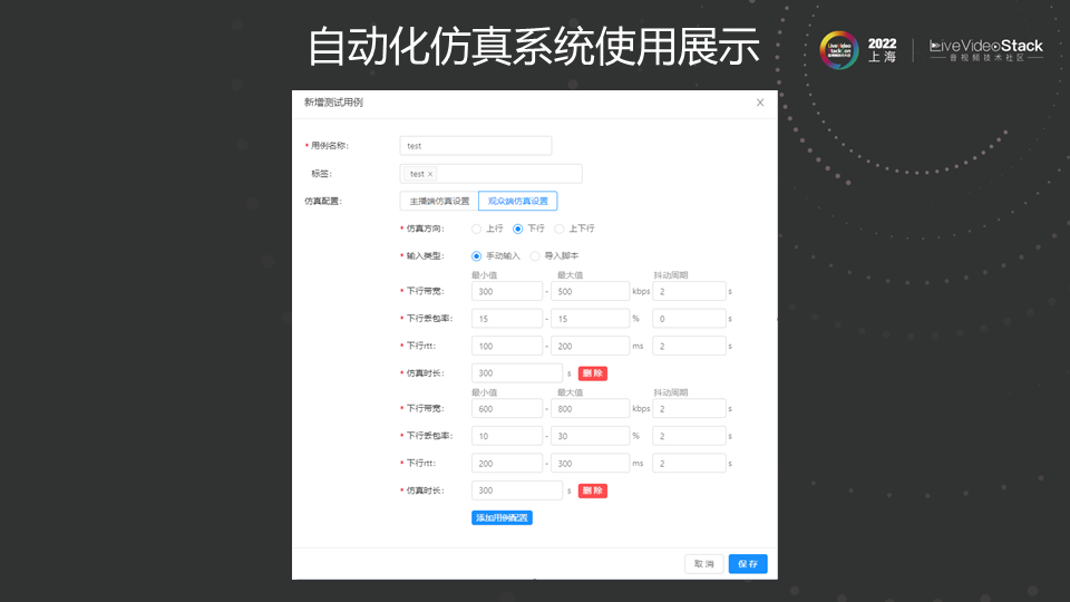 上图创建弱网用例的例子展示了我们能够对主播和观众的弱网进行设置。另外也可以构造各种网络形式的弱网。导入脚本功能实际上就是用户网络重放,导入采集到的用户的真实网络形成的脚本,形成用户真实网络的弱网用例。