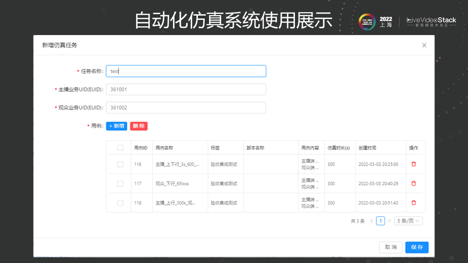 上图为创建仿真任务的页面,一个任务可以包含多个用例,执行顺序、时长都可以进行调整。