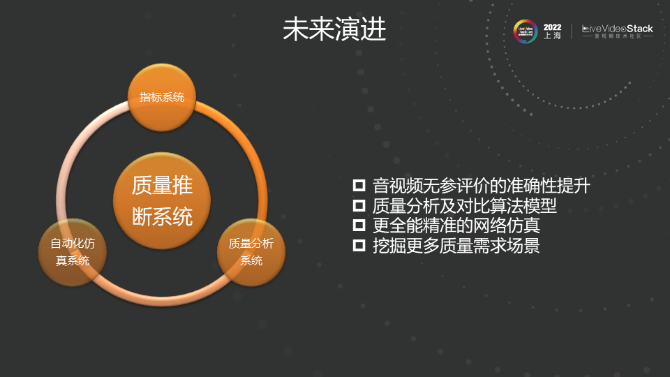 但尽管已经实现了质量推断系统的闭环,仍旧存在一些问题。比如音视频无参评价的准确性,在不同场景下有不同的语音场景,音视频质量评价在这方面仍需提升准确度;比如质量分析及对比算法模型,尽管质量推断系统支持任何指标的多指标分析和评价,但分析的准确性也有待提升,后续也会引入更多对比算法模型进行综合评价;比如提供更全能精准的网络仿真,虽然目前具有网络损伤仪的功能,但是实际上和损伤仪的精度还有有一定差异,后续会引入其他仿真方案提高仿真的准确性;