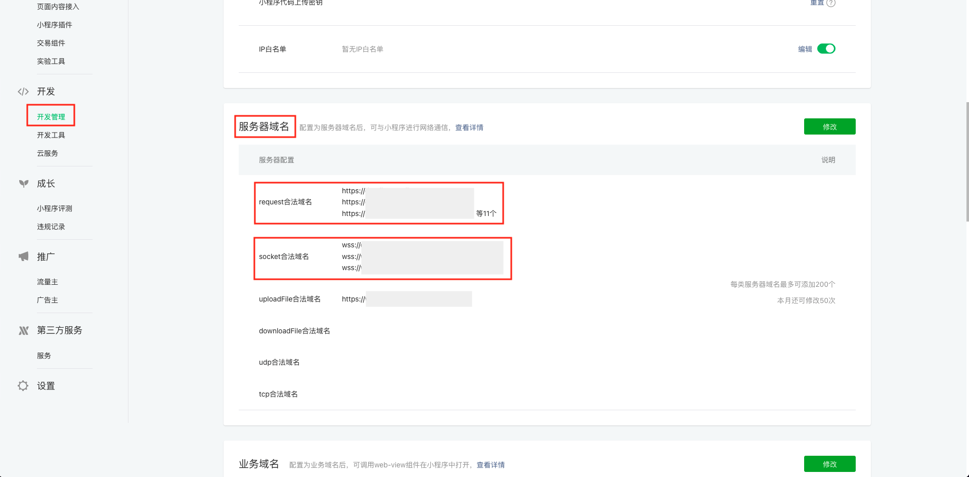 - 服务器域名配置:在“小程序后台 > 开发管理 > 开发设置 > 服务器域名”中,按照协议分类,将即构 Server 地址、LogUrl、以及用户业务需要用到的地址填到指定的“socket合法域名”或“request合法域名”中,详情请参考 控制台 – 项目信息。