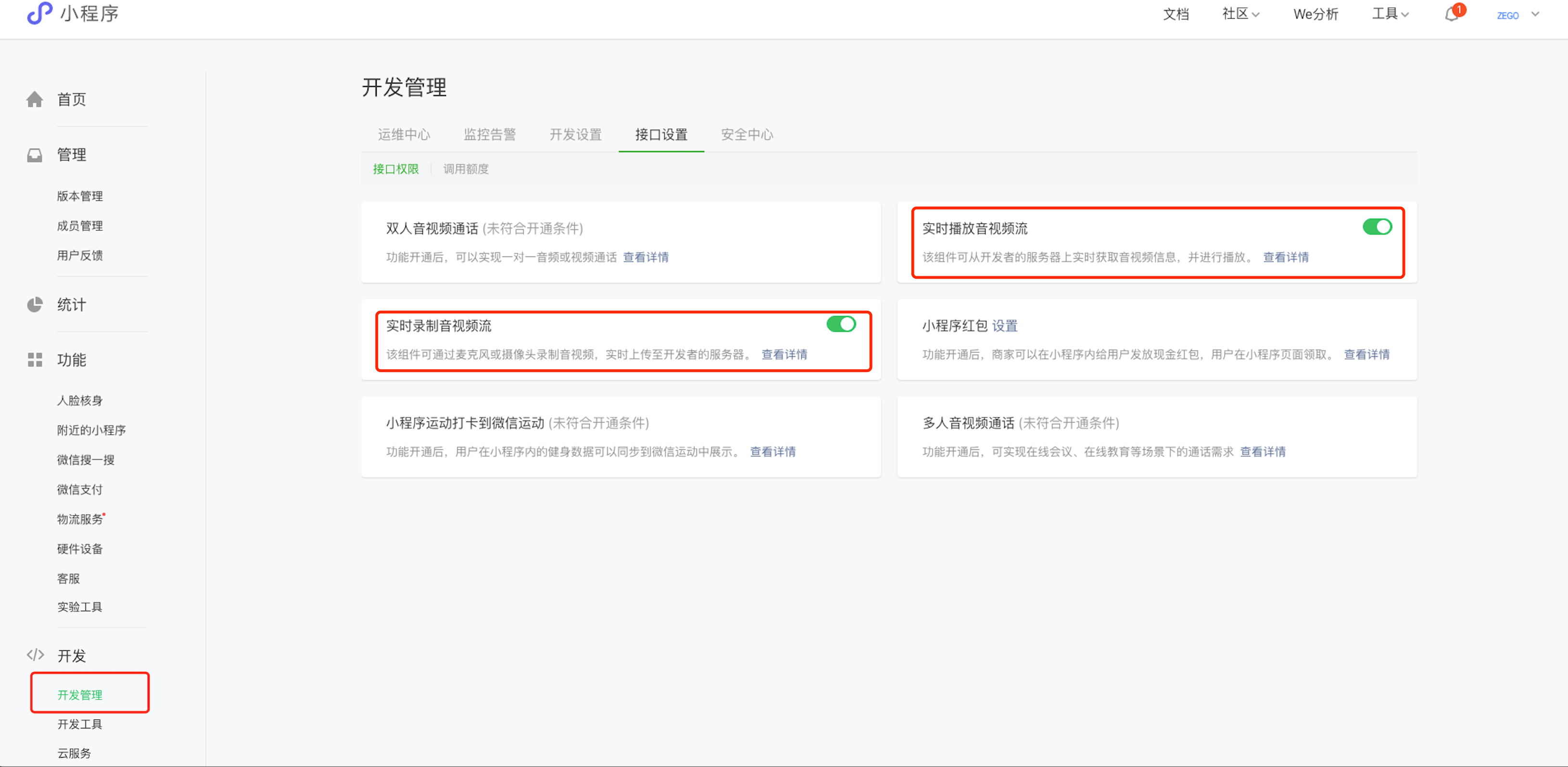 相关功能开启:在“小程序后台 > 开发管理 > 接口设置 > 接口权限”中,打开 实时播放音视频流 和 实时录制音视频流 功能开关。