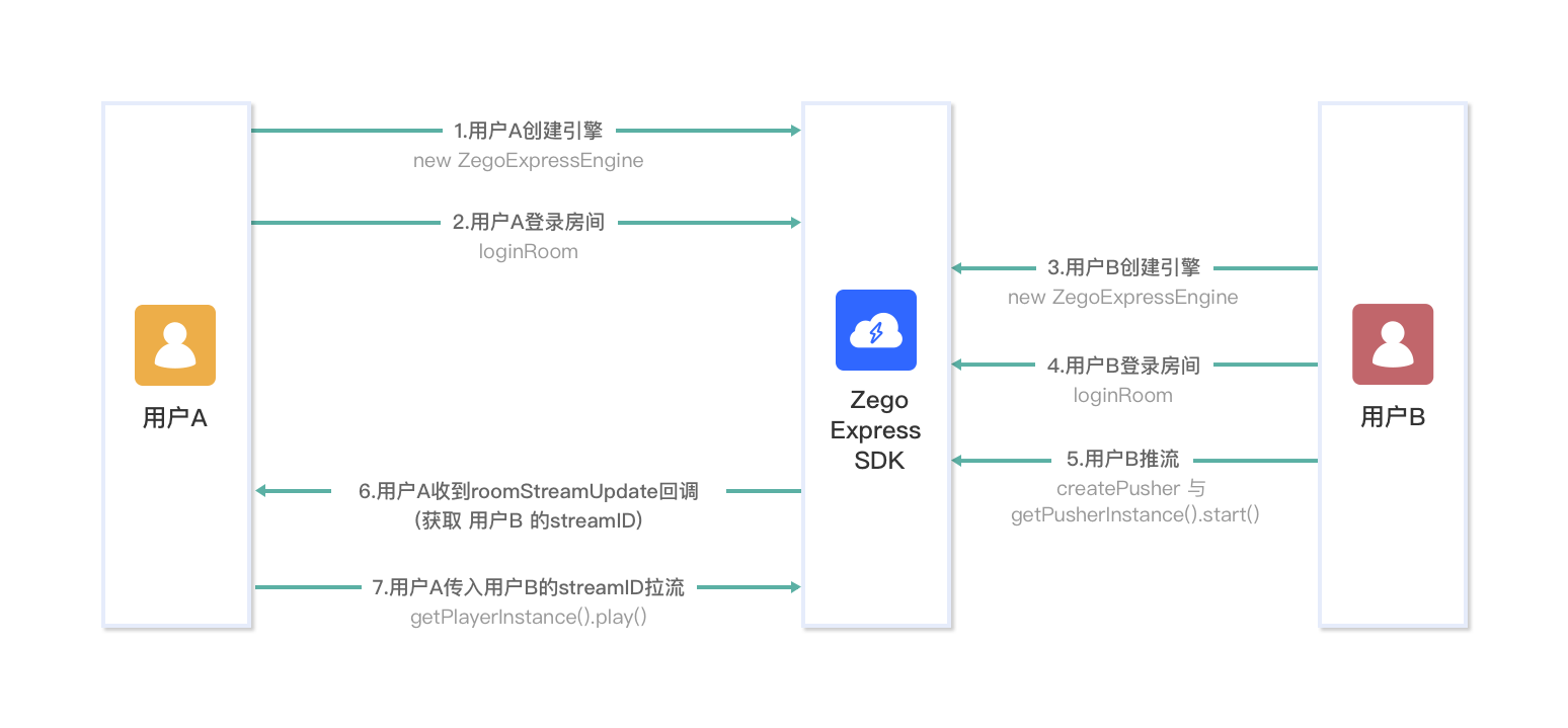 用户 A、B 加入房间,用户 B 预览并将音频流推送到 ZEGO 云服务(推流),用户 A 收到用户 B 推送音频流的通知之后,在通知中播放用户 B 的音频流(拉流)。