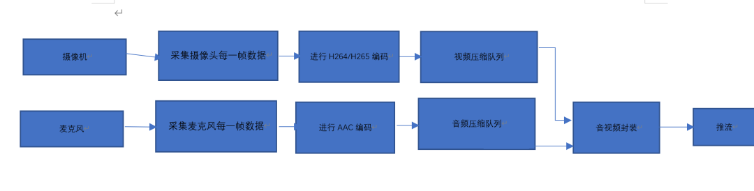 - 2.1.第一步:采集摄像头、麦克风的数据: 编码的第一步基本上都是采集视频、音频的数据,并把采集到的数据送到对应的音视频编码器。视频数据送到H264/H265编码器,音频数据送到AAC编码器,编码处理过后分别送到视频编码队列和音频编码队列。