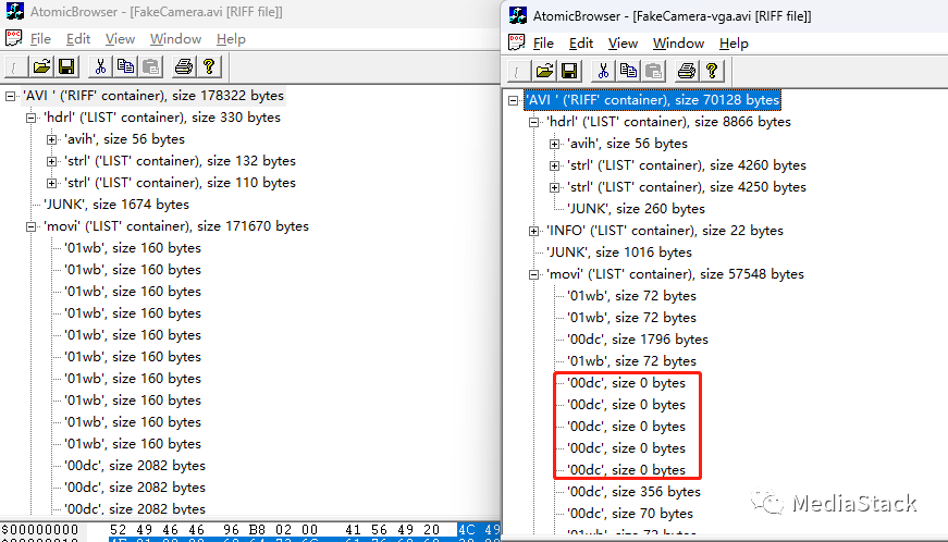 新的文件在movi列表栏,有多个字段是空值。难道在读取视频数据大小时,如果是空值就调用stop操作了?
