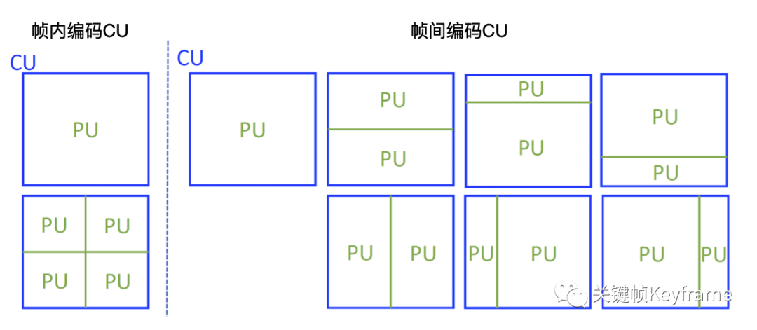 - 每个 CU 可以划分为 1 个、2 个、4 个预测单元(PU);