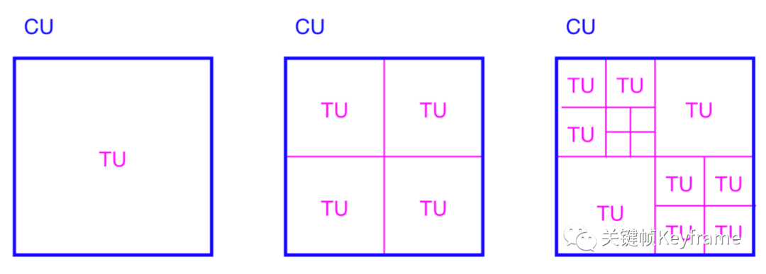 - 每个 CU 可以按四叉树划分为变换单元 TU(最大 32×32,最小 4×4);