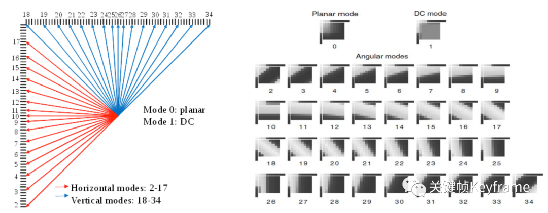 H.264 基于 4×4 大小的编码块采用 9 种预测模式,基于 16×16 大小的编码块采用 4 种预测模式。考虑高清视频纹理的多样性,只采用 H.264 中提供的几种帧内预测模式是远远不够的。为了更准确地反映纹理特性,降低预测误差,H.265 共提供了 35 种帧内预测模式,包括 33 种角度预测以及 DC 预测模式和 Planar 预测模式。增加的预测模式可以更好地匹配视频中复杂的纹理,得到更好的预测效果,更加有效地去除空间冗余。