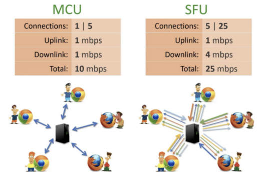 RTC媒体分发系统通常还分为SFU(Selective Forwarding Unit)和MCU(MultiPoint Control Unit)两种分发架构,如图4所示。