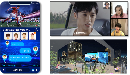在直播观影/观赛的互动场景,咪咕视频推出了云包厢、云观影、云观众、云打Call等业务。在云观赛场景中,咪咕视频“云包厢”实现云聚会看比赛,在享受精彩赛事的同时,基于RTC实时互动网络,准实时的端到端时延,稳定流畅的数据传输,身处各地的朋友可以如面对面般进行赛事评论和聊天,极大提升观赛的娱乐性和沉浸感。
